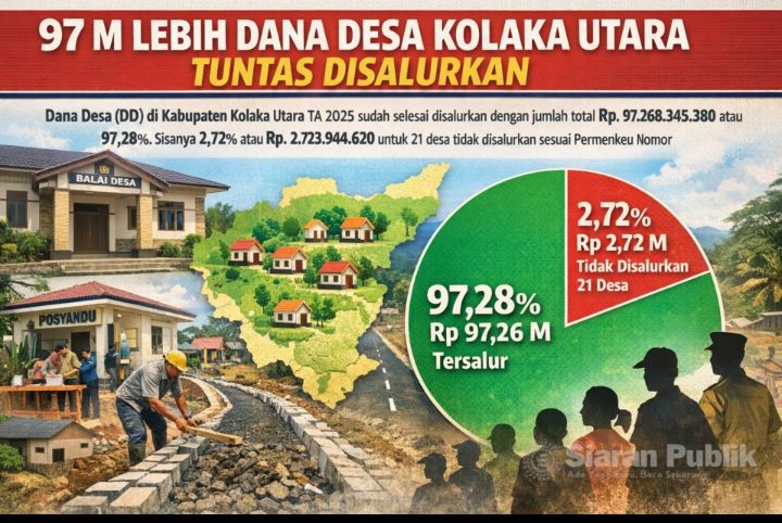 Kepala BKAD Kolaka Utara, Buhari, menjelaskan bahwa hingga akhir tahun anggaran, realisasi penyaluran Dana Desa telah mencapai Rp97.268.345.380 atau 97,28 persen dari total pagu yang ditetapkan.