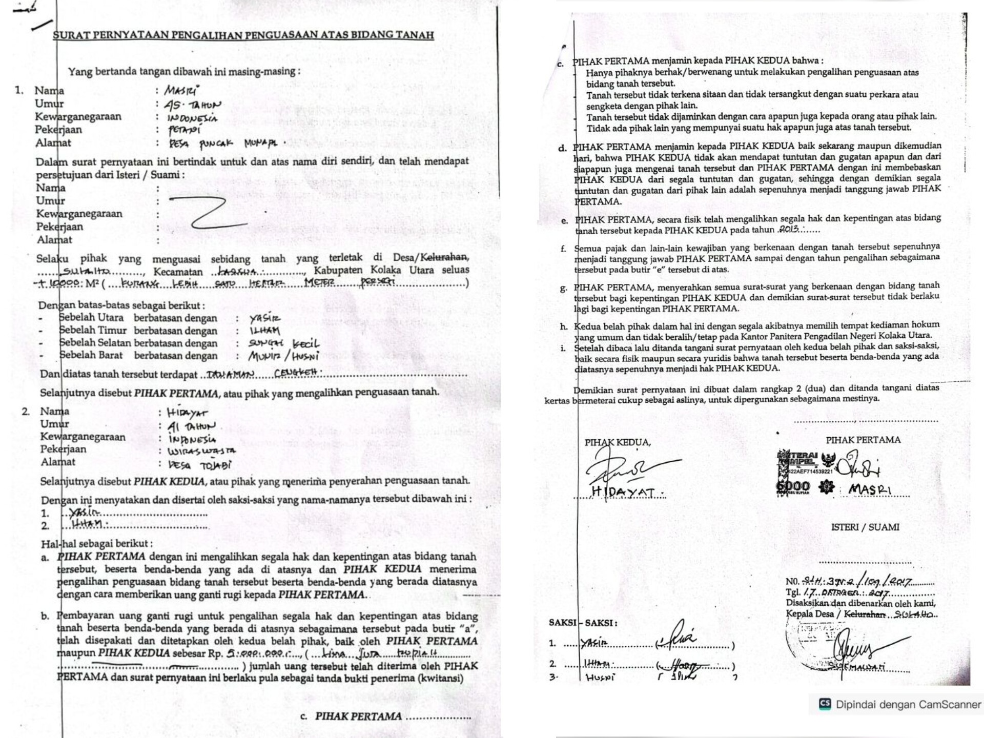 perjanjian pengalihan lahan tersebut sebagai saksi yang berbatasan langsung dengan lahan tersebut.